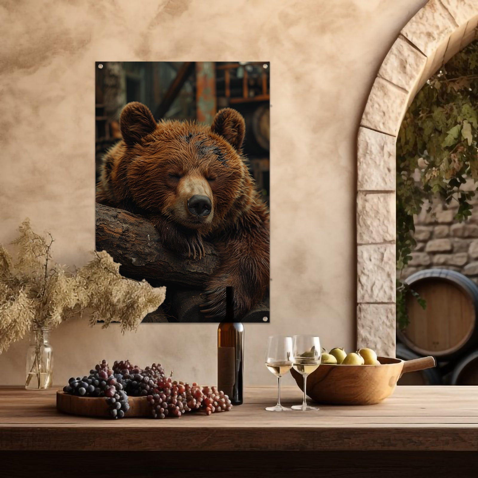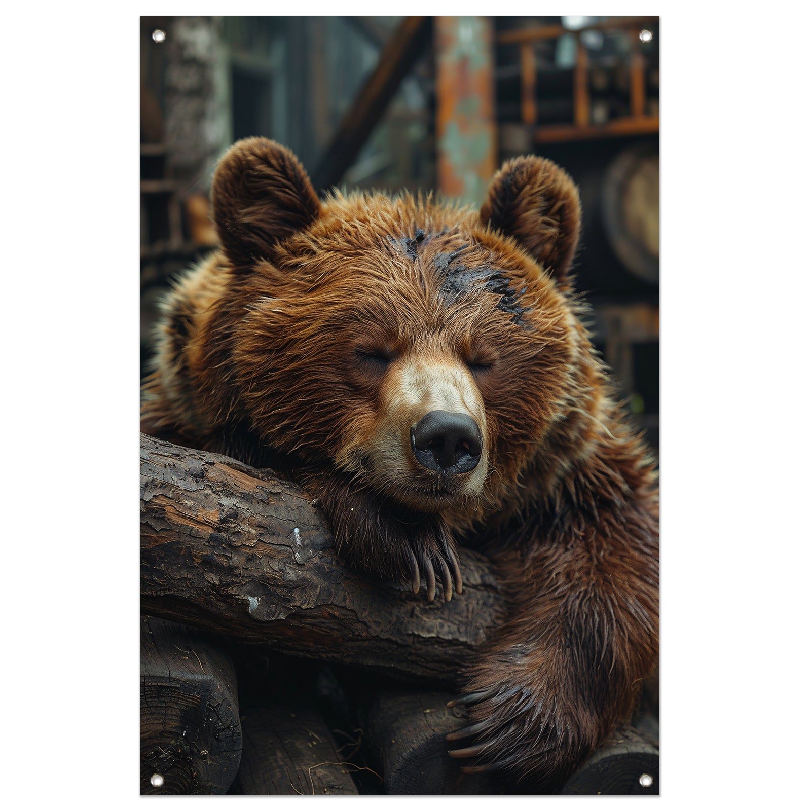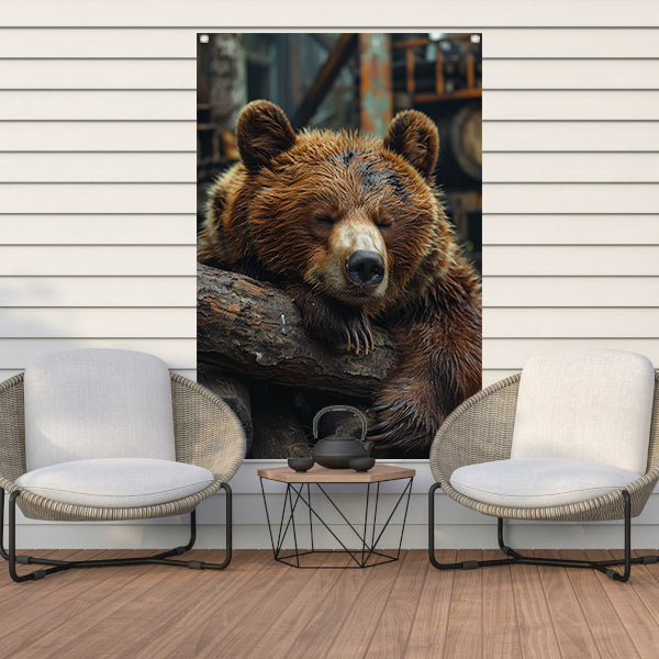 Slapende Bruine Beer op Boomstammen tuinposter