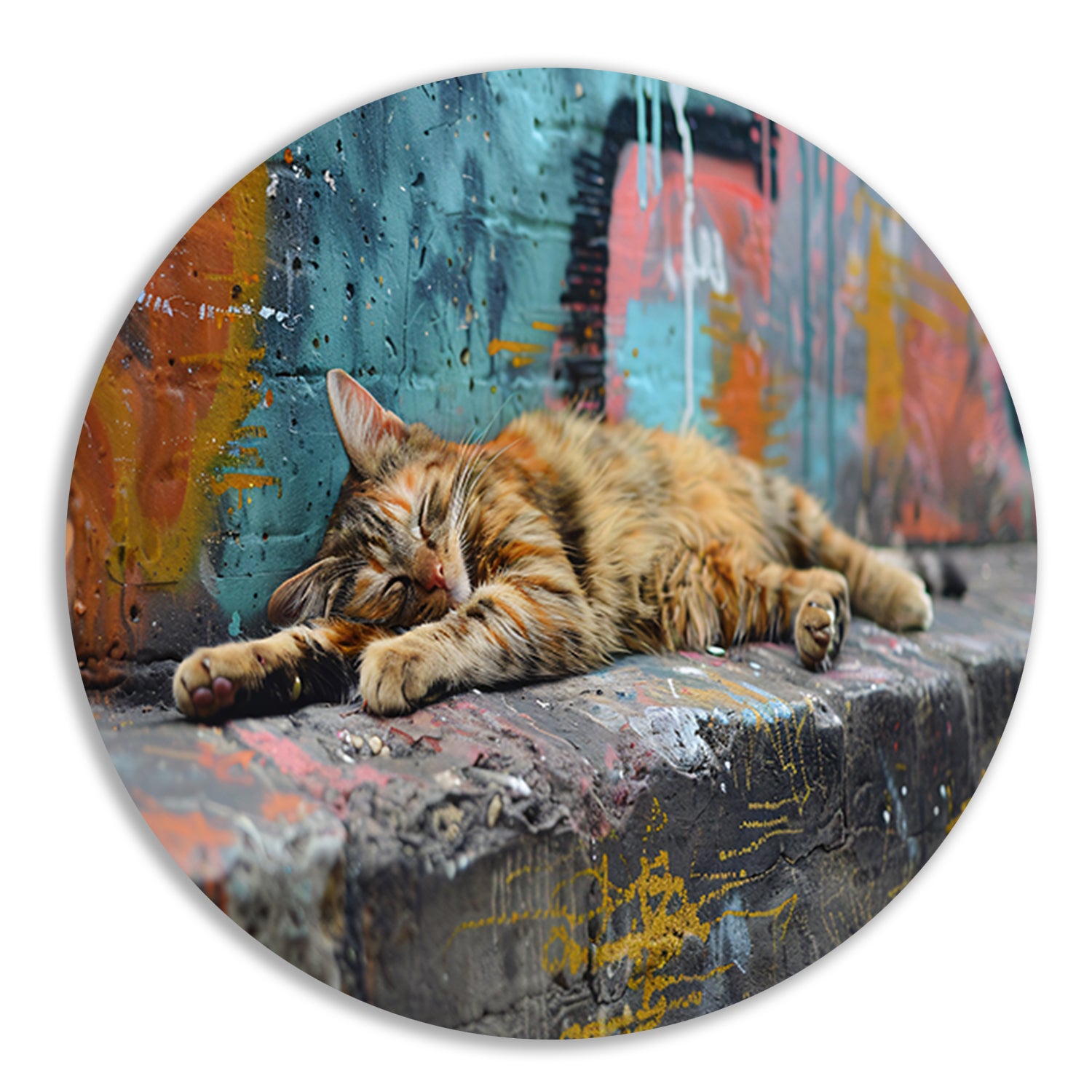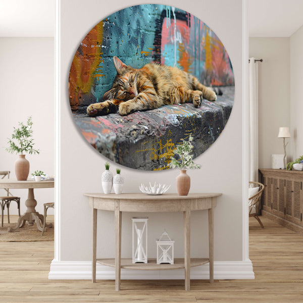 De afbeelding van de slapende kat bij de gekleurde muur is gedrukt met levendige en hoogwaardige kleuren, waardoor het een echte eyecatcher is in elke kamer. Bovendien is deze muurcirkel verkrijgbaar in diverse formaten, zodat je de perfecte maat kunt kiezen voor jouw ruimte.