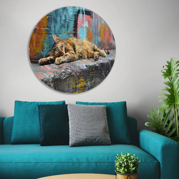 Slapende kat bij gekleurde muur aluminium muurcirkel