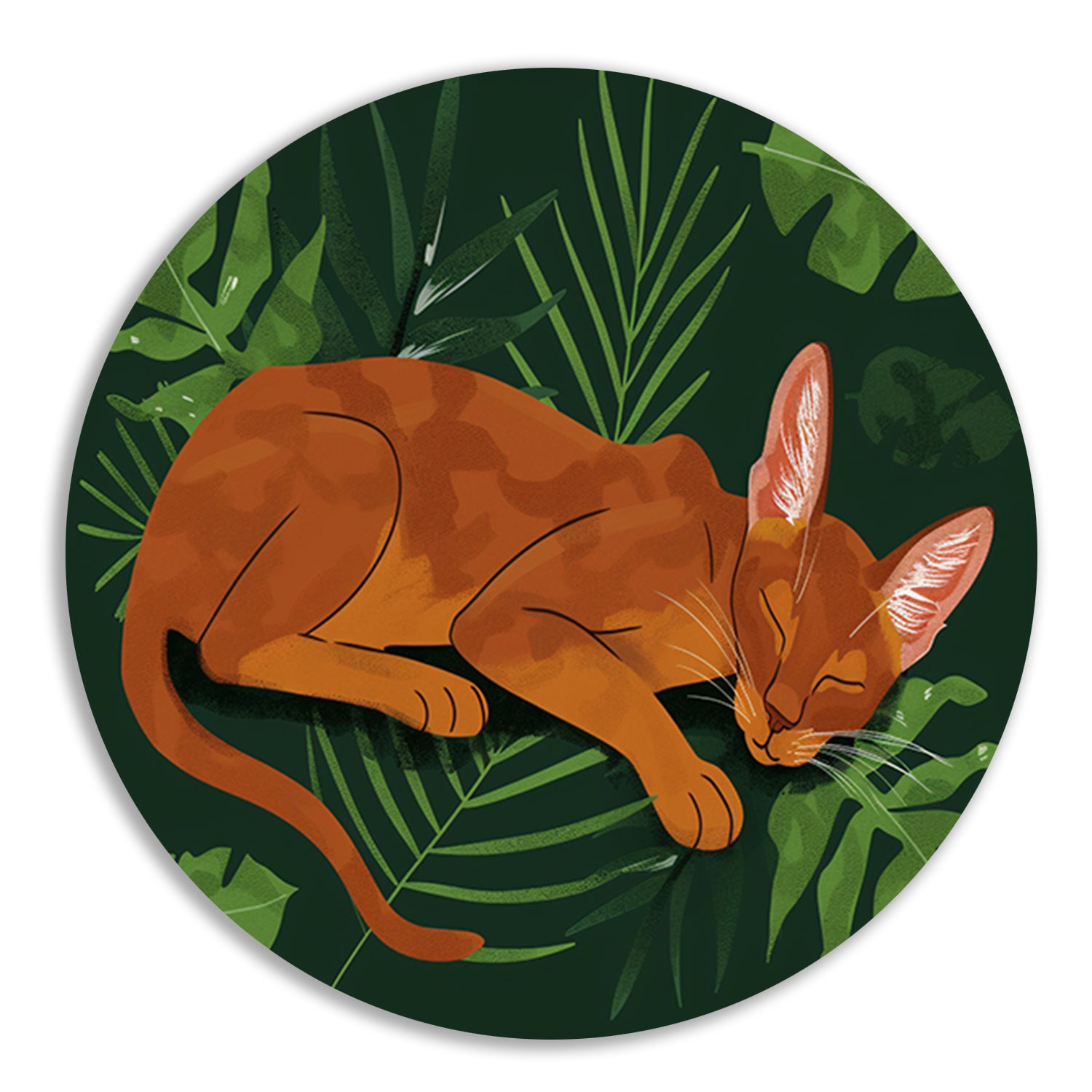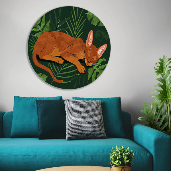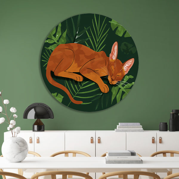 Slapende kat tussen tropische bladeren schilderij aluminium muurcirkel