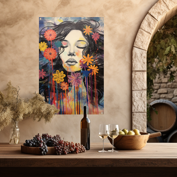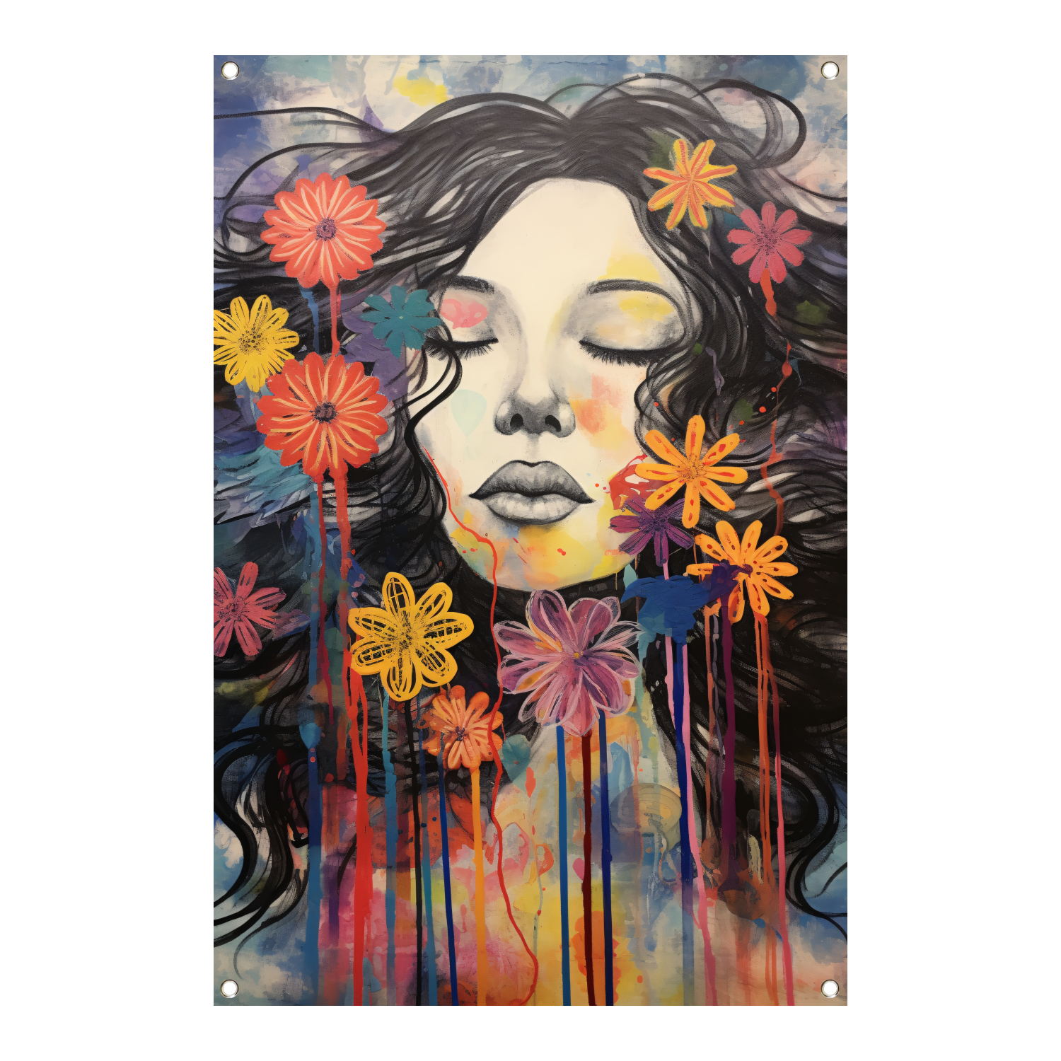 Deze prachtige tuinposter is een echte eyecatcher voor in jouw tuin. Het thema van deze poster is een slapende vrouw omringd door een explosie van kleurrijke bloemen. De kleuren spatten van de poster af en zorgen voor een vrolijke en levendige sfeer in jouw tuin.
