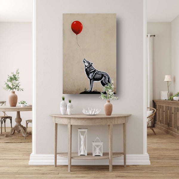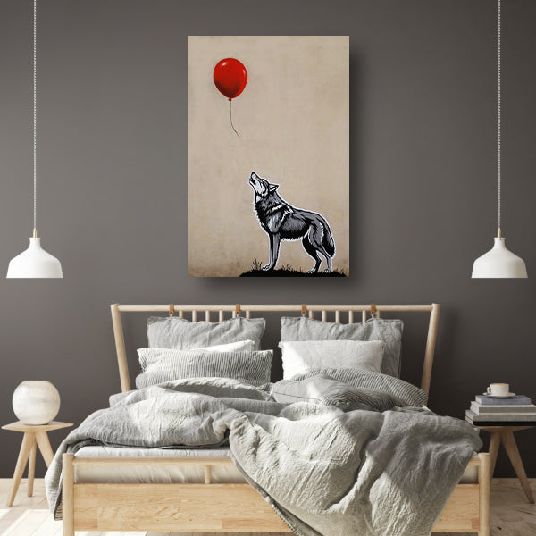 Starende wolf en de vliegende rode ballon canvas met baklijst