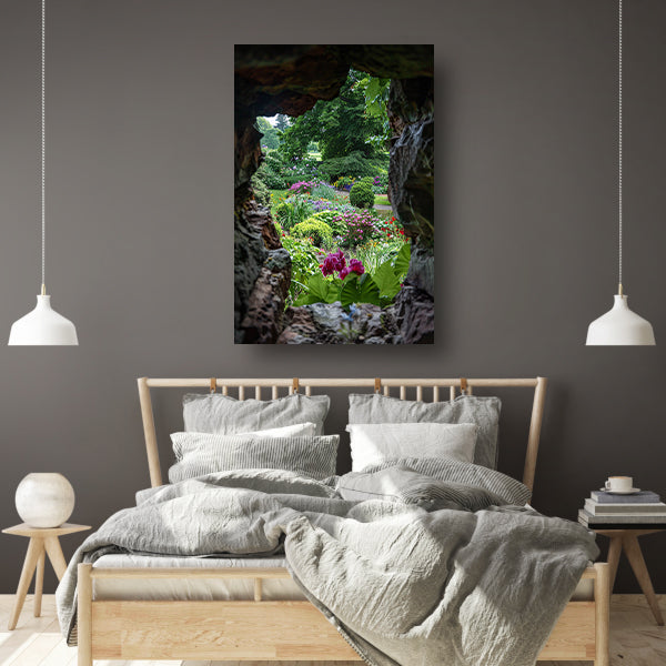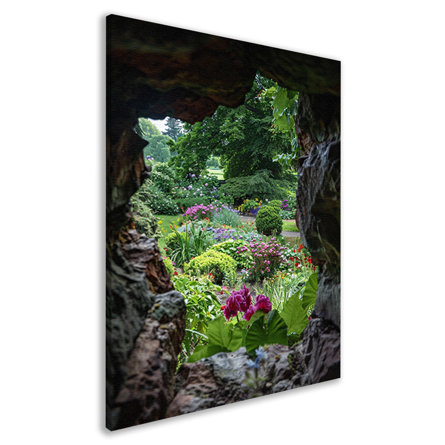Stenen Raam met Uitzicht op Bloementuin canvas