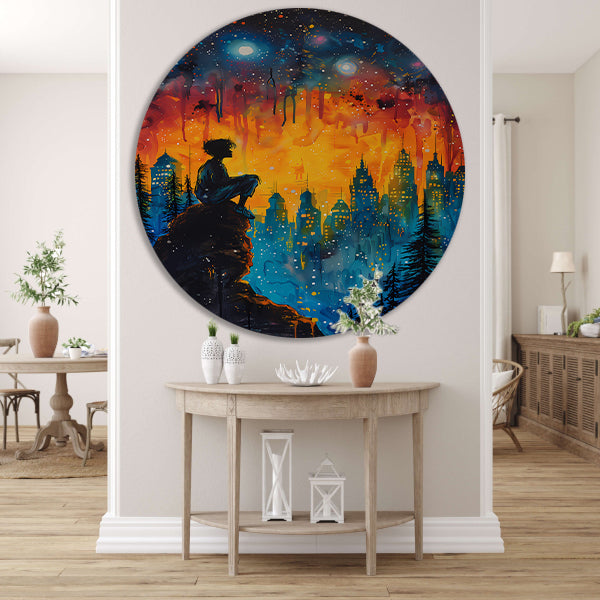 De afbeelding van een serene sterrenhemel boven een pittoresk Provençaals dorp is gedrukt op de cirkelvormige plaat, waardoor een uniek en sfeervol effect ontstaat in jouw woning. De muurcirkel is verkrijgbaar in allerlei formaten, zodat je hem perfect kunt afstemmen op de afmetingen van jouw muur.