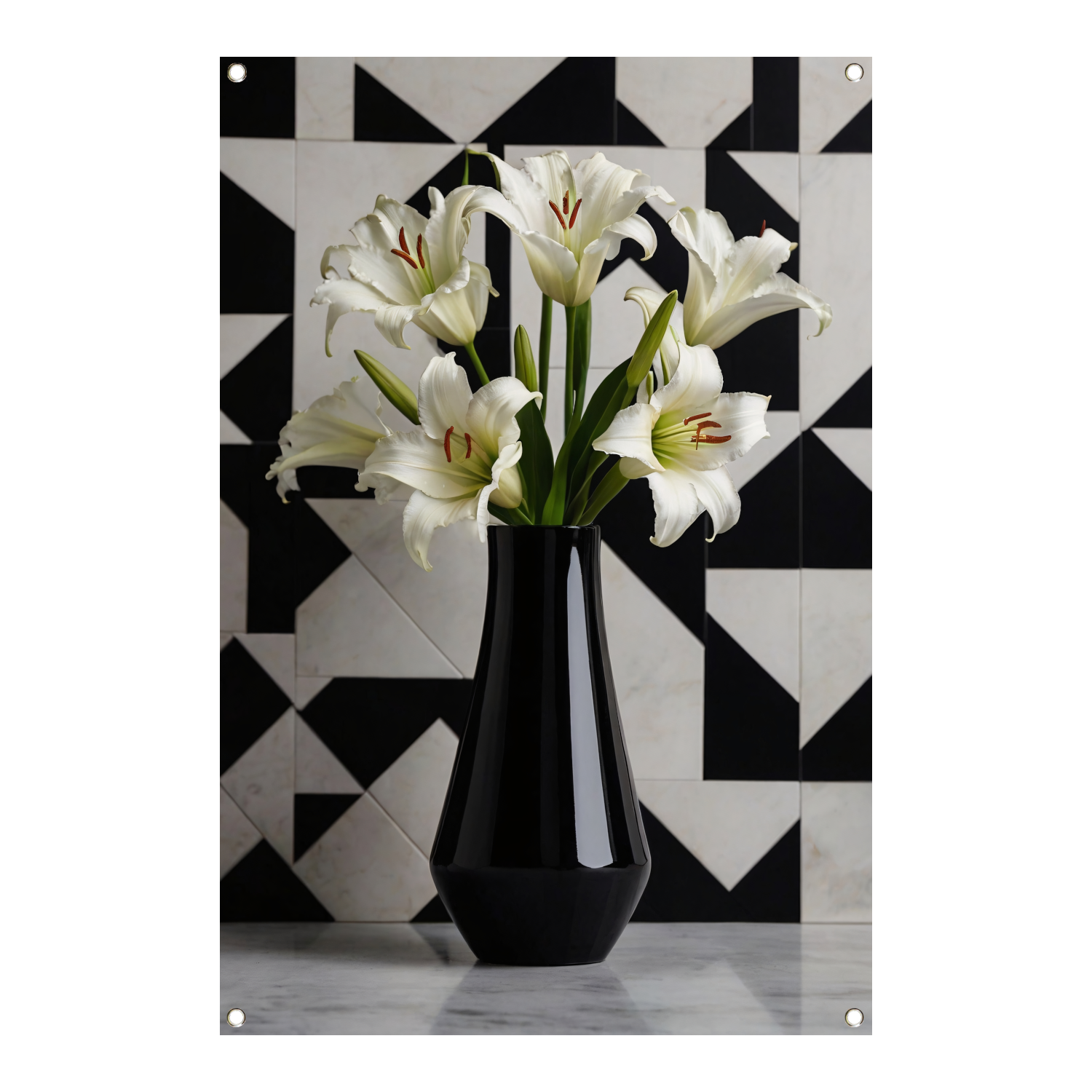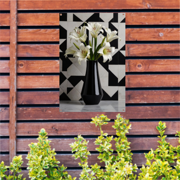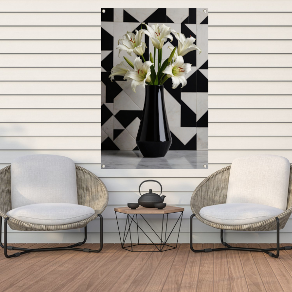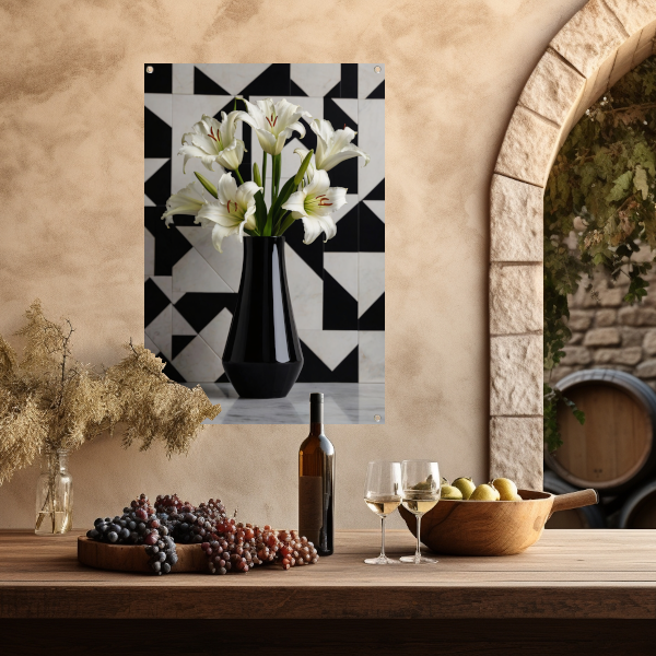 Stijlvolle Lelies in Zwart-witte Geometrische Setting tuinposter
