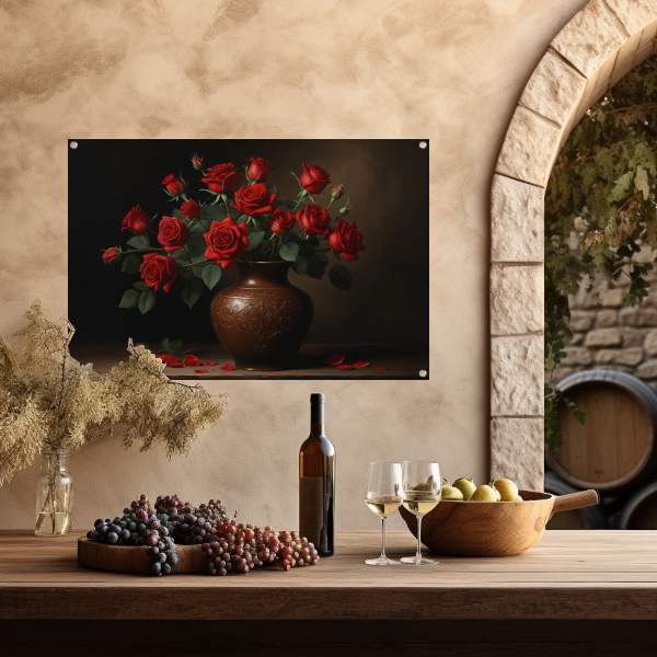 Voeg een vleugje stille elegantie toe aan jouw tuin met deze prachtige tuinposter van rode rozen in een sierlijke vaas. Bestel nu en geniet van de schoonheid en sfeer die deze poster met zich meebrengt.