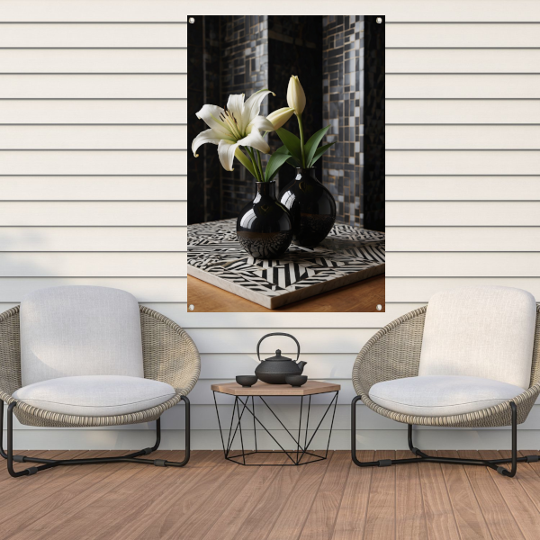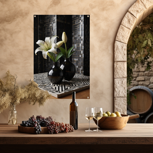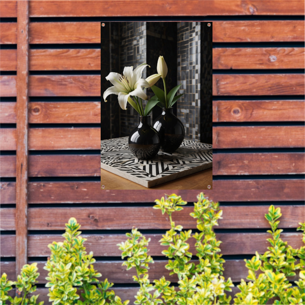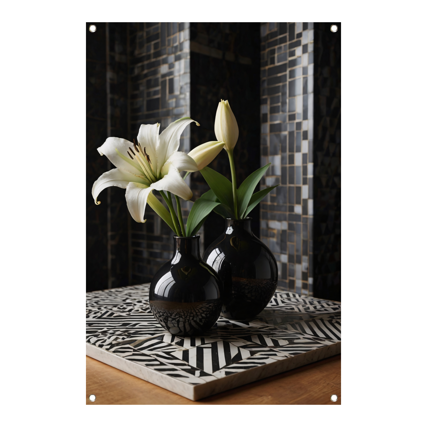 Stilleven met Lelies in Zwart-Witte Vazen tuinposter