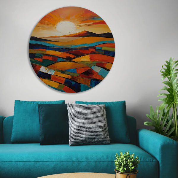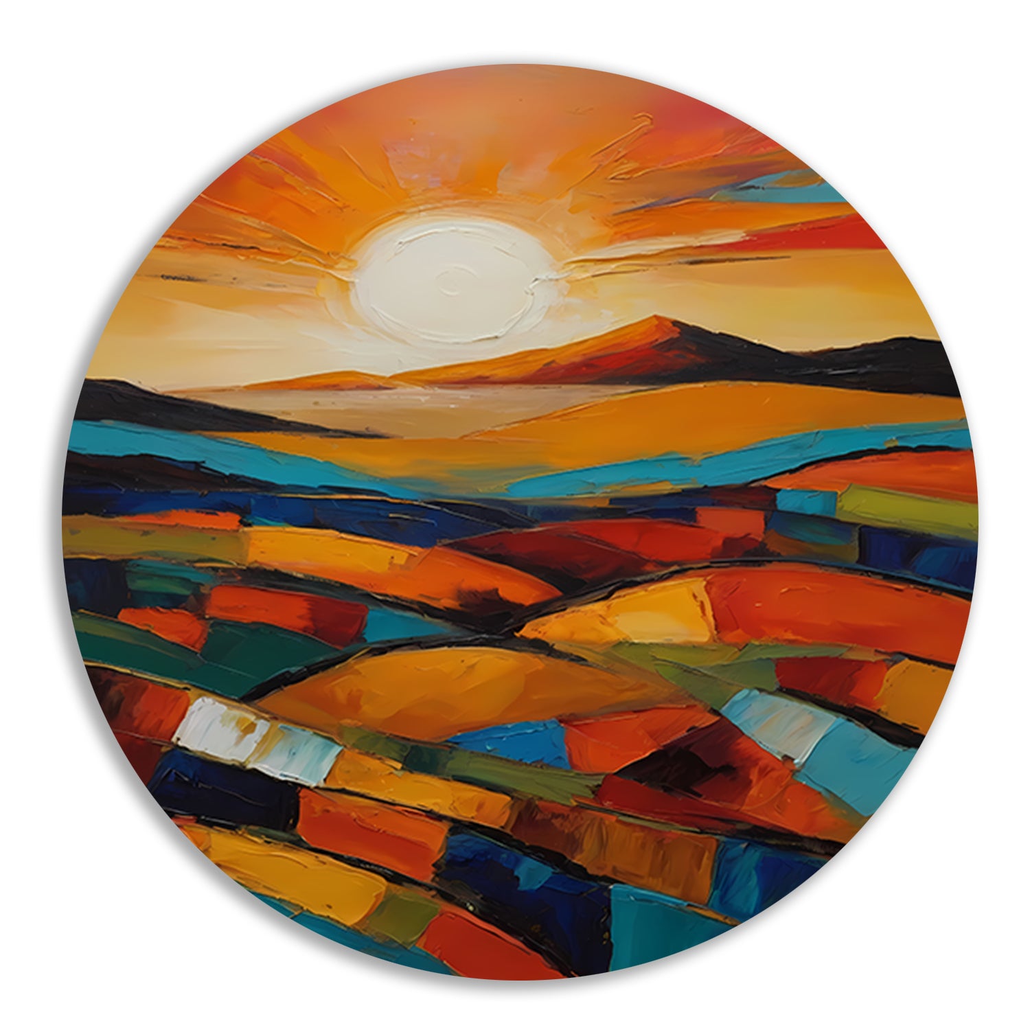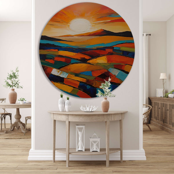 Stralende zon boven kleurrijke abstracte velden aluminium muurcirkel
