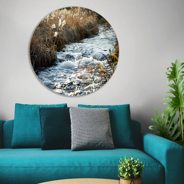 Stromende kreek omgeven door wilde flora aluminium muurcirkel