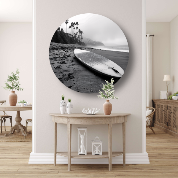 Surfplank en palmbomen op mistig strand aluminium muurcirkel