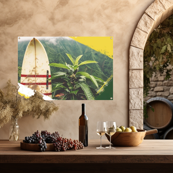 Surfplank en tropische plant met bergzicht tuinposter