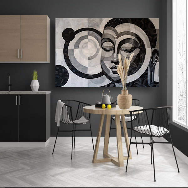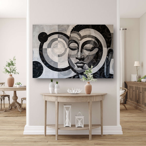 Surrealistisch Boeddha ontwerp met geometrische patronen canvas met baklijst