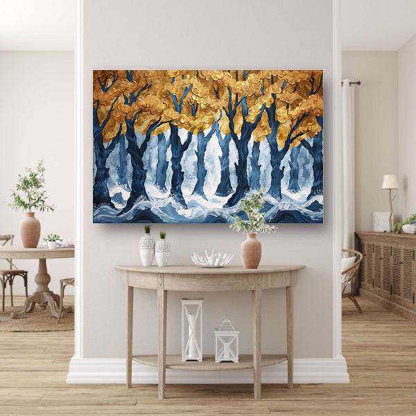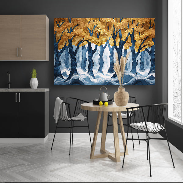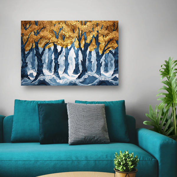 Surrealistisch bos met gouden bomen en water acrylglas