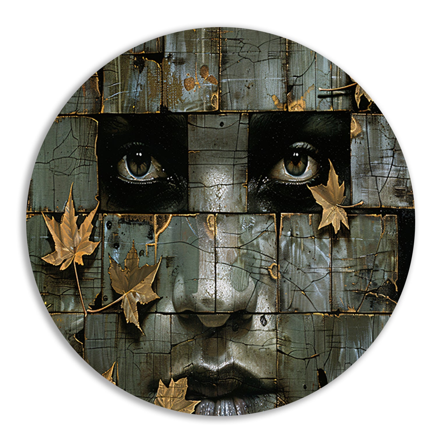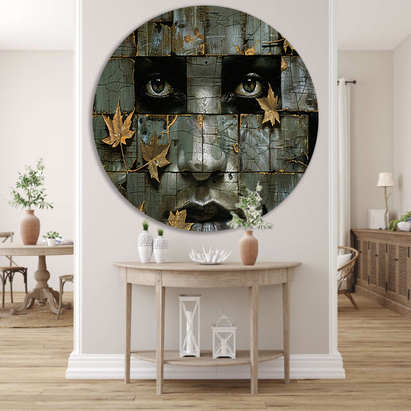 Surrealistisch gezicht met gouden bladeren kunstwerk aluminium muurcirkel