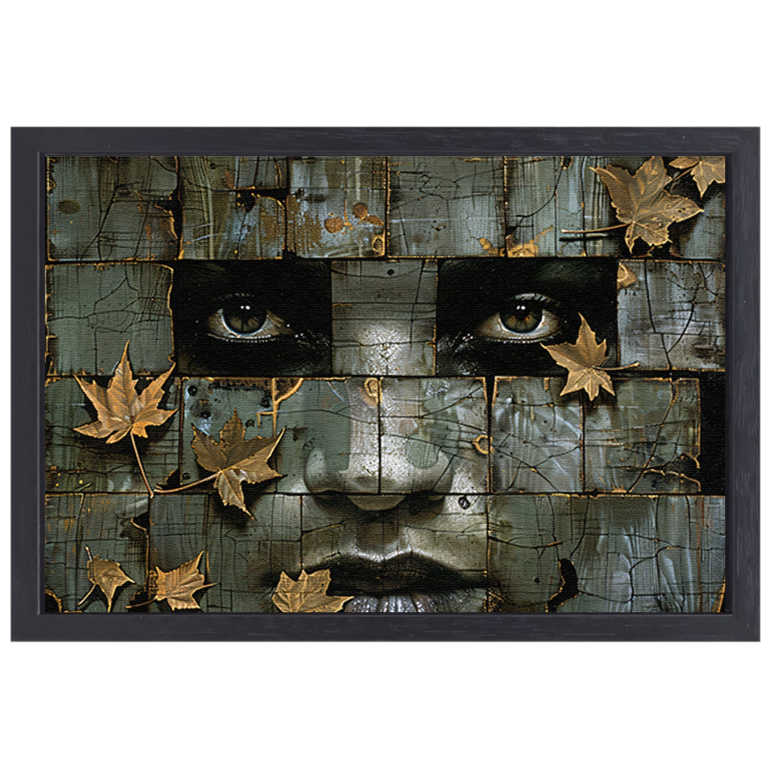 Surrealistisch gezicht met gouden bladeren kunstwerk canvas met baklijst