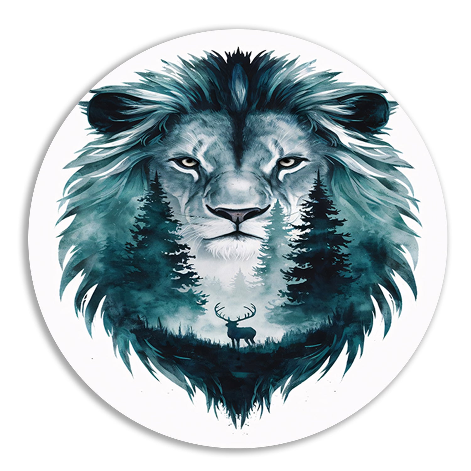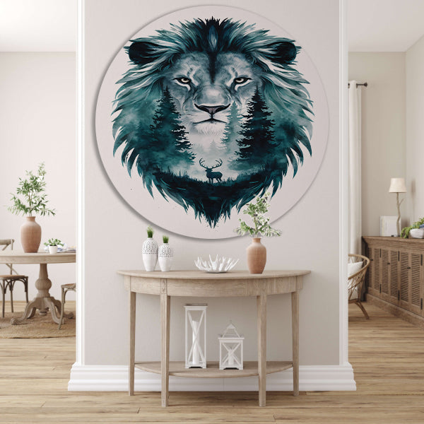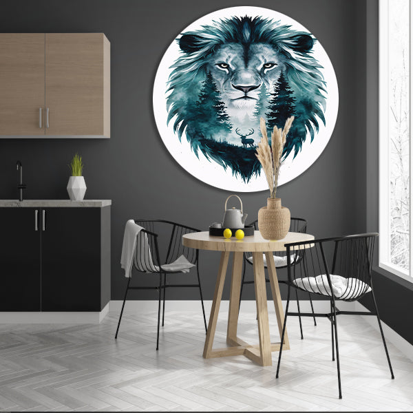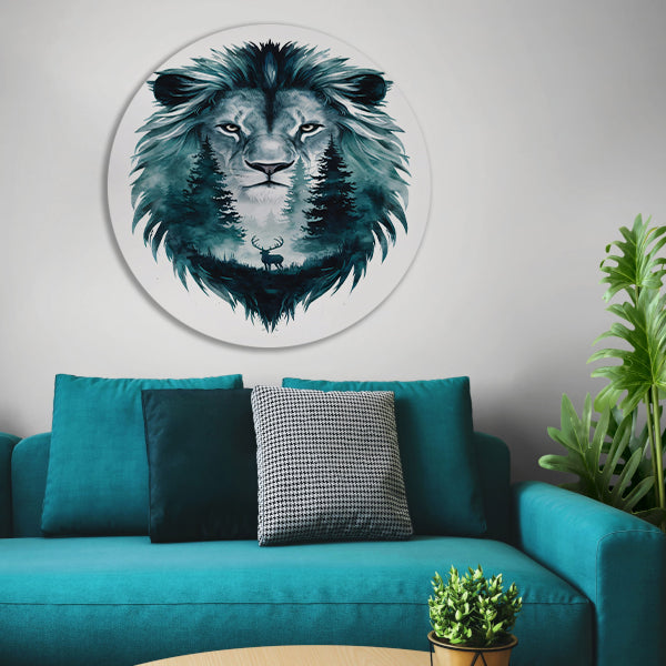 Surrealistisch portret van leeuw en hert aluminium muurcirkel