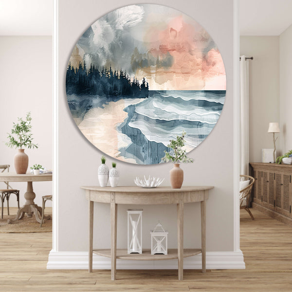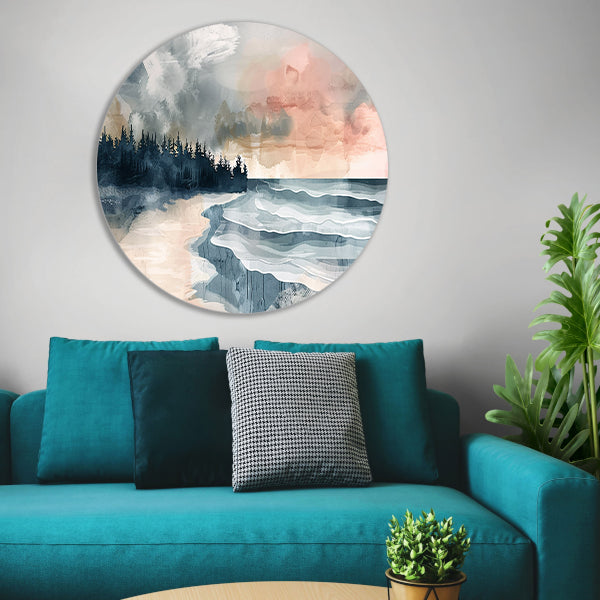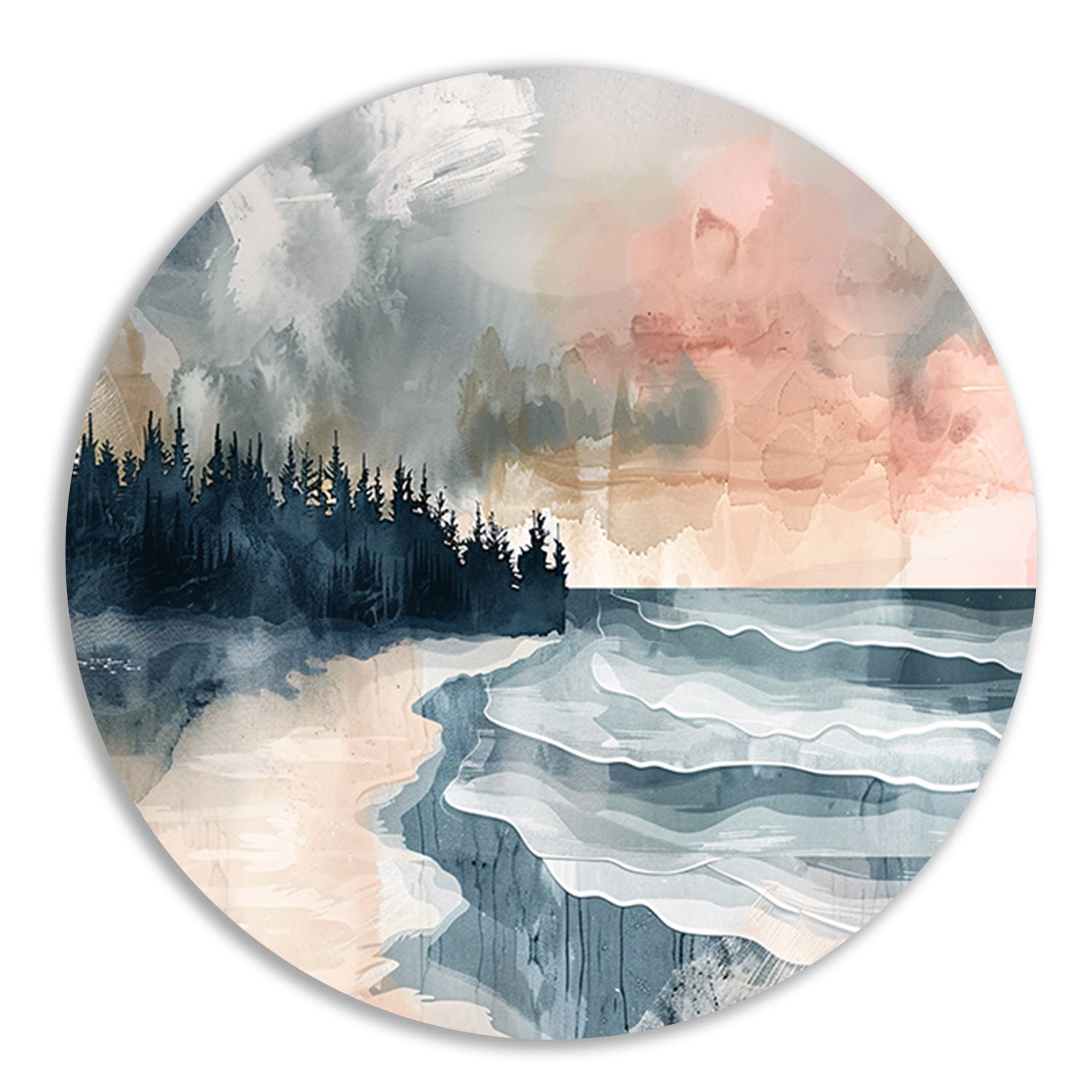 Surrealistisch strandlandschap met schilderachtige bomen aluminium muurcirkel