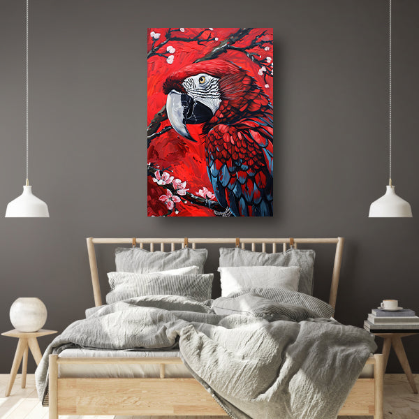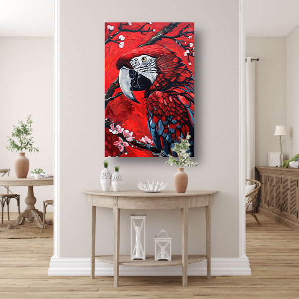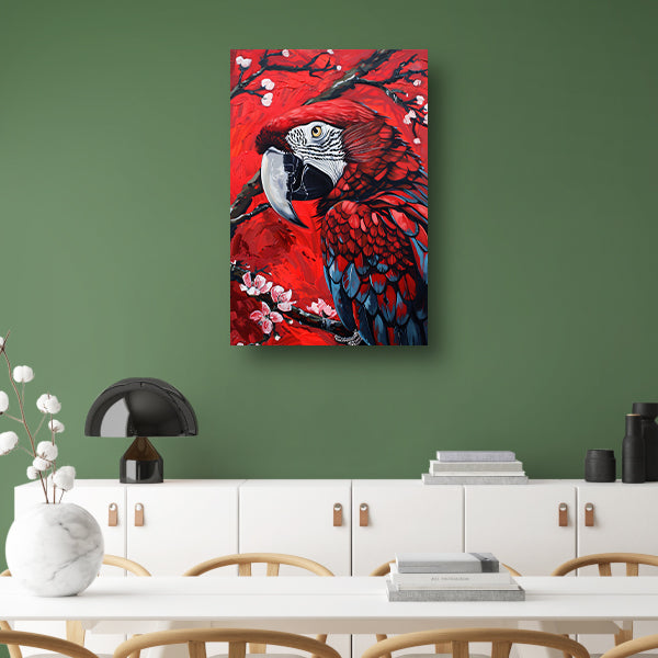 Surrealistische papegaai met bloesem op rode achtergrond acrylglas