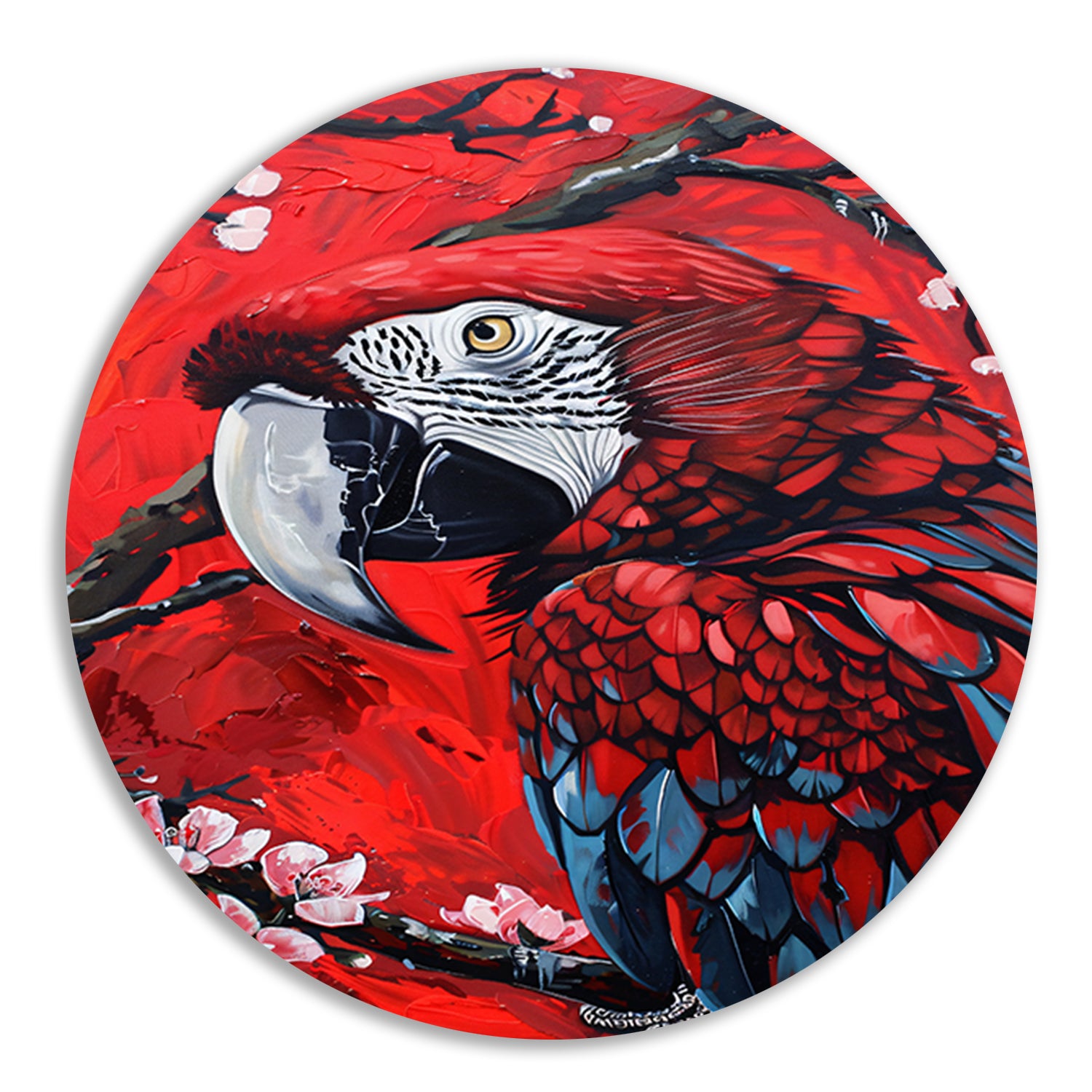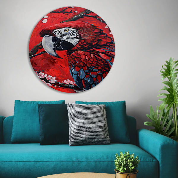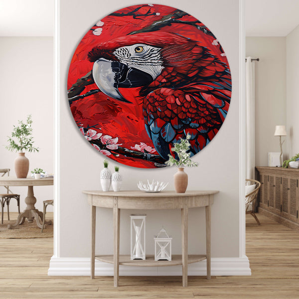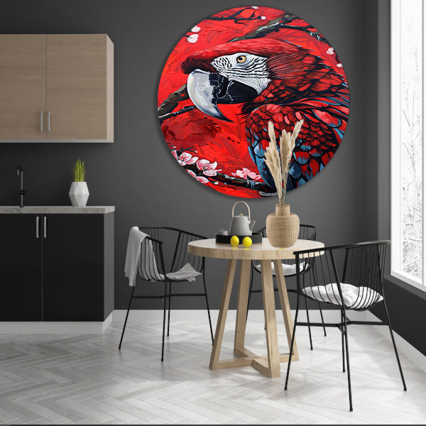 Surrealistische papegaai met bloesem op rode achtergrond forex muurcirkel