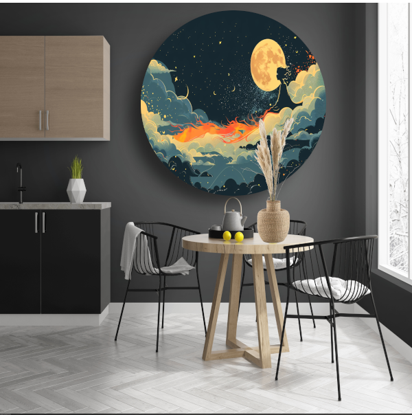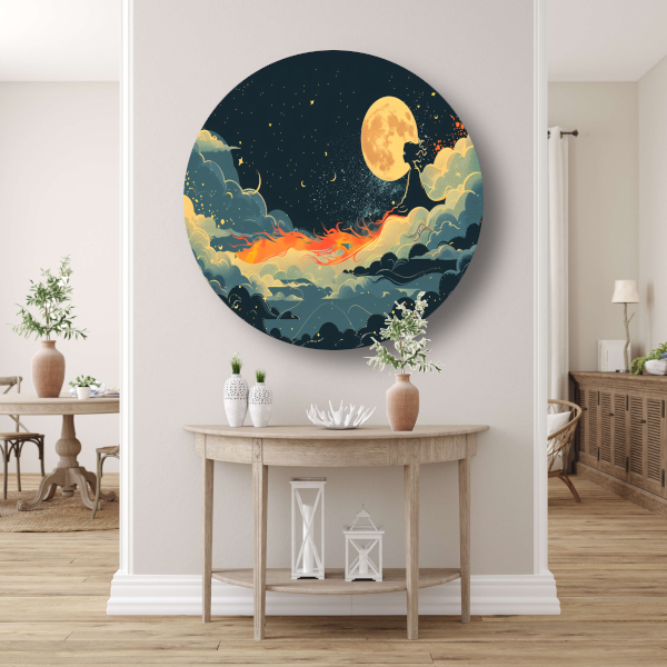 De muurcirkel wordt geleverd met een gratis ophangplaat, waardoor je hem eenvoudig aan de muur kunt bevestigen. Daarnaast is de muurcirkel verkrijgbaar in diverse maten, waardoor je de perfecte afmeting voor jouw ruimte kunt kiezen. Of je nu op zoek bent naar een statement piece voor in de woonkamer, slaapkamer of kantoor, deze surrealistische vliegende leeuw maan muurcirkel zal zeker de aandacht trekken en een unieke sfeer creëren. Voeg dit kunstwerk toe aan je collectie en geniet van de surrealistische schoonheid elke keer dat je er naar kijkt.