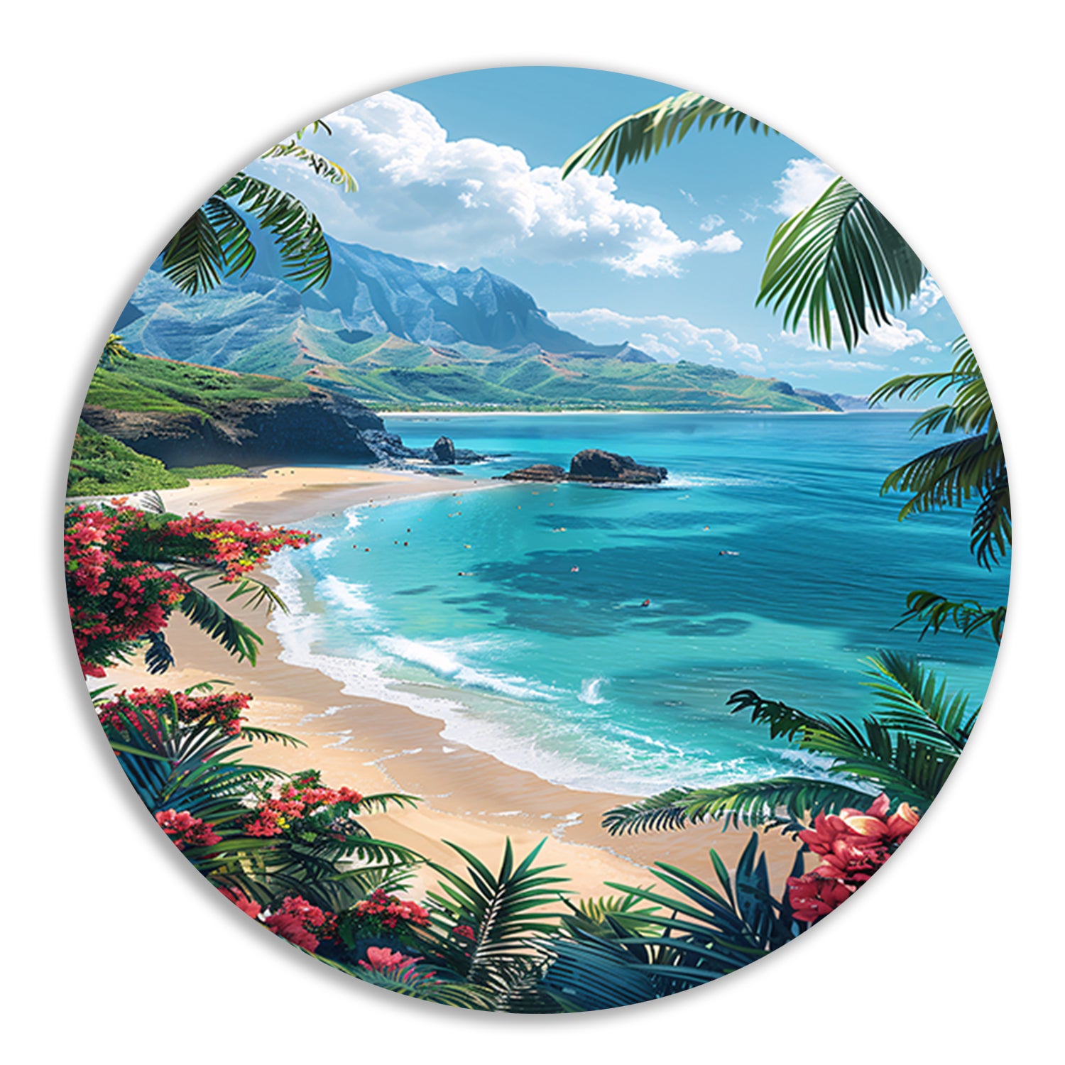 Dankzij de haarscherpe print en levendige kleuren komt het tropische strand echt tot leven in jouw kamer. De muurcirkel is verkrijgbaar in diverse formaten, zodat je altijd de perfecte afmeting voor jouw muur kunt kiezen.
