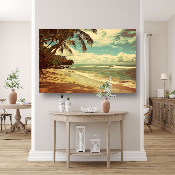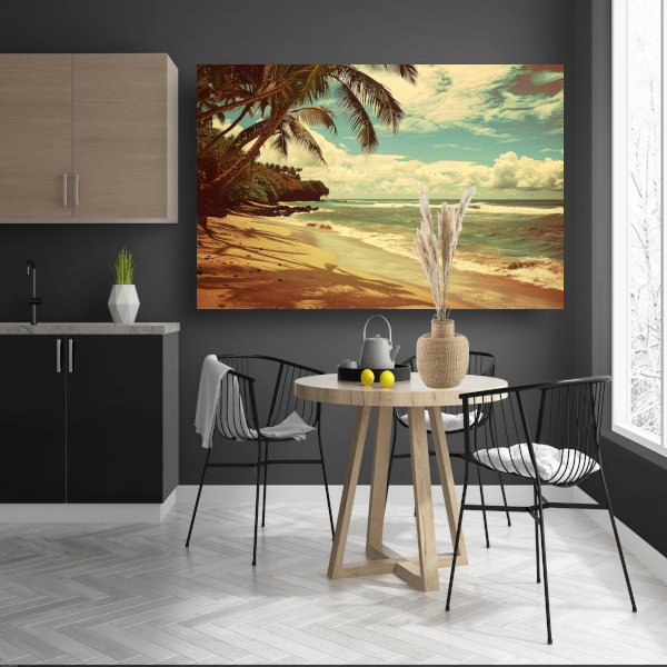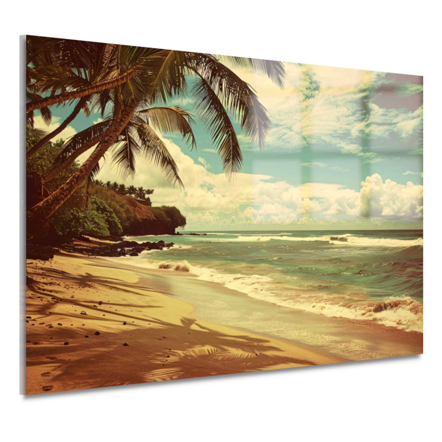 Of je nu een vleugje exotische flair aan je woonkamer wilt toevoegen of een rustgevende omgeving in de slaapkamer wilt creëren, dit tropische strand met palmbomen op acrylglas is de perfecte keuze. De kleuren zijn levendig en de details zijn scherp, waardoor de afbeelding echt tot leven komt in jouw interieur.
