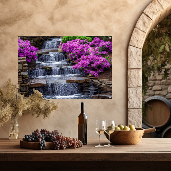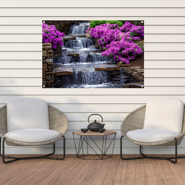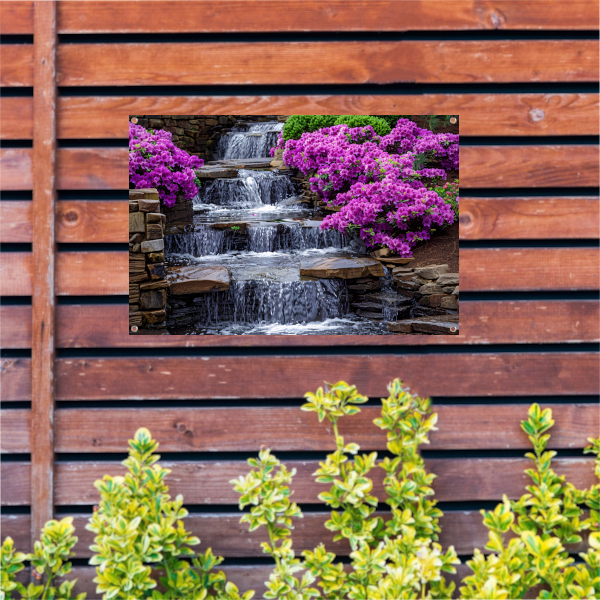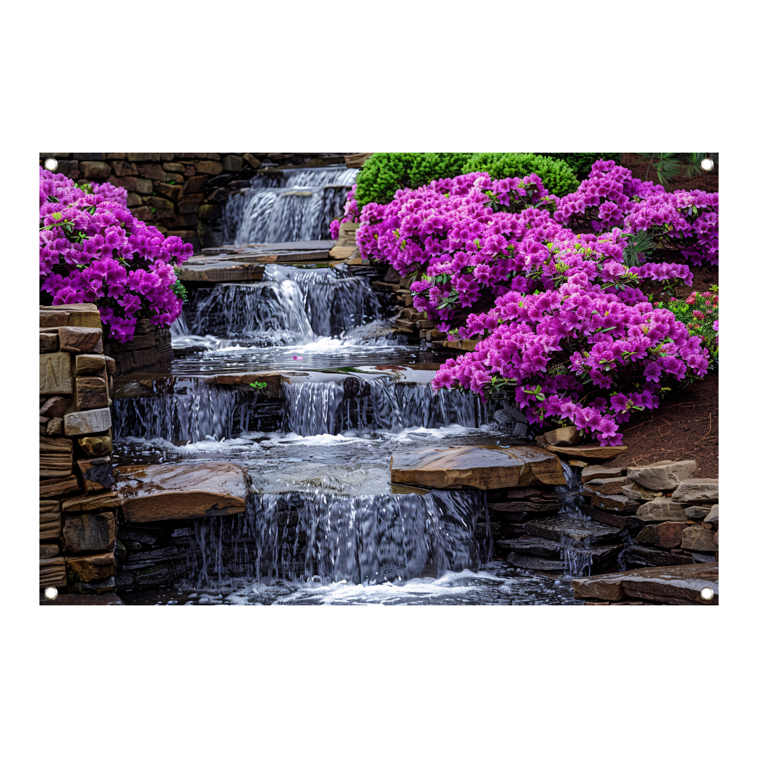 Tuin met paarse rhododendrons en watervallen tuinposter
