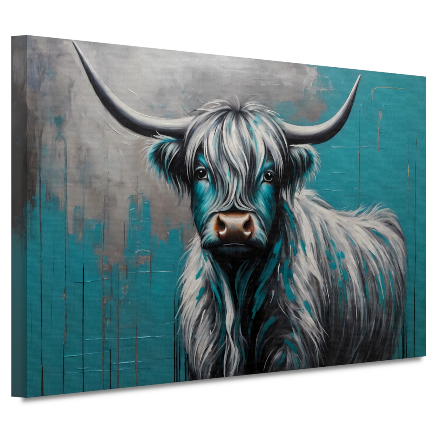 Het thema van dit schilderij is de natuur, met als hoofdrolspeler de majestueuze hooglander. De kleuren turquoise en zilver zijn geïnspireerd op de kleuren van de natuur en geven het schilderij een rustgevende en serene sfeer. De stijl van dit canvas is modern en past perfect in verschillende interieurstijlen.