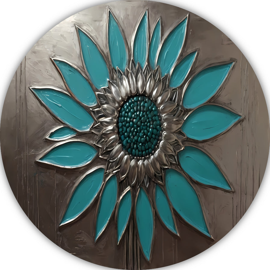 Turquoise en Zilveren Zonnebloem Kunstwerk aluminium muurcirkel