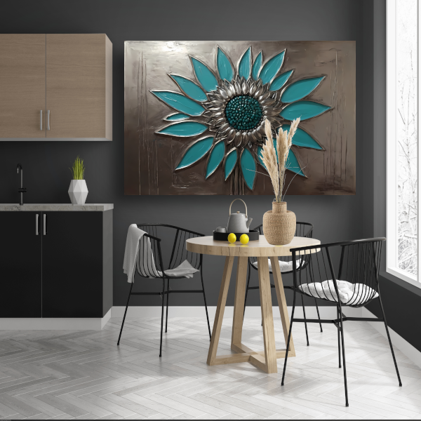 Turquoise en Zilveren Zonnebloem Kunstwerk canvas met baklijst