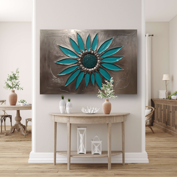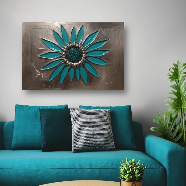Turquoise Zonnebloem in Metalen Stijl Decor canvas met baklijst