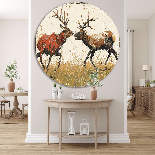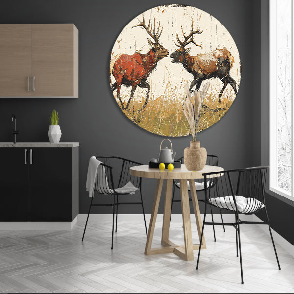 Breng de pracht van de natuur in huis met deze unieke muurcirkel van twee herten gevecht in het bos. Bestel vandaag nog en geniet van een stukje natuurlijke schoonheid in jouw interieur!