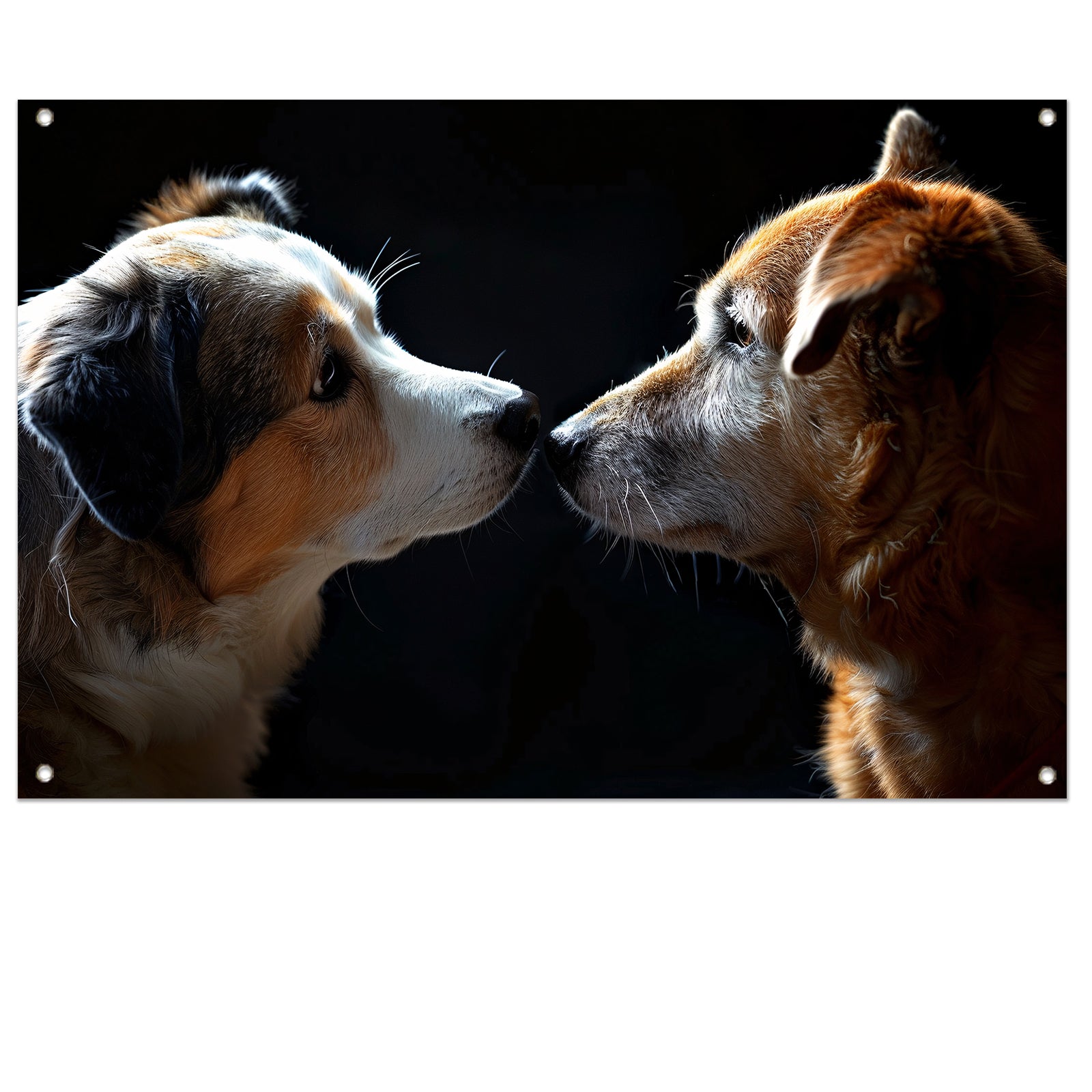 Twee honden in donkere omgeving kijken elkaar aan tuinposter