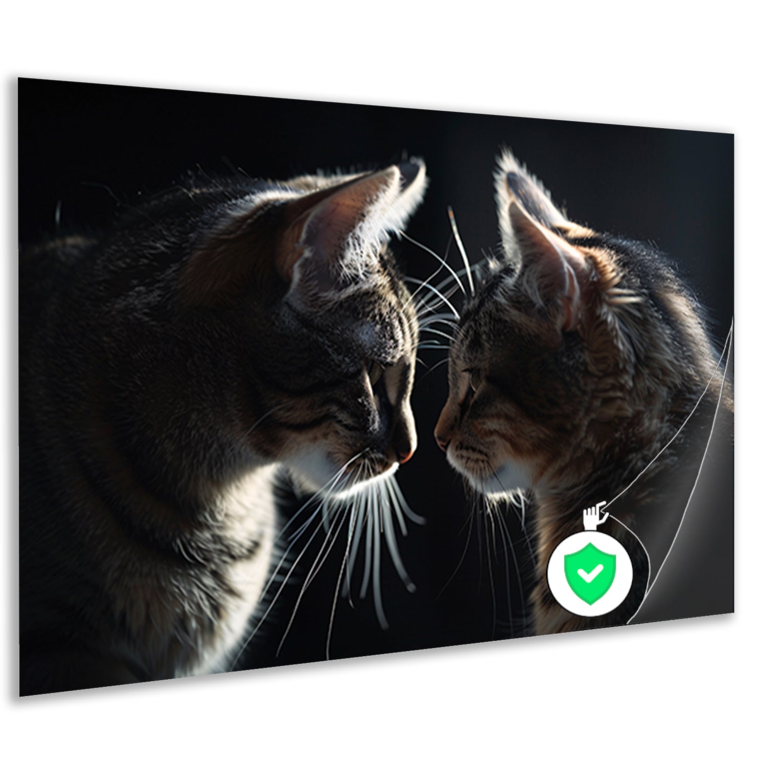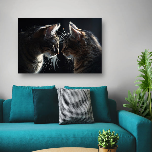 Twee katten in donkere omgeving kijken elkaar aan poster