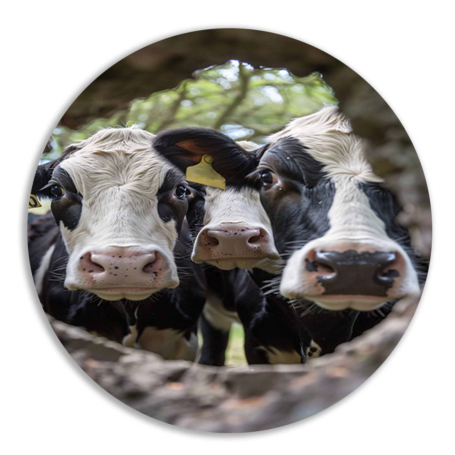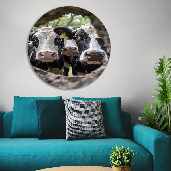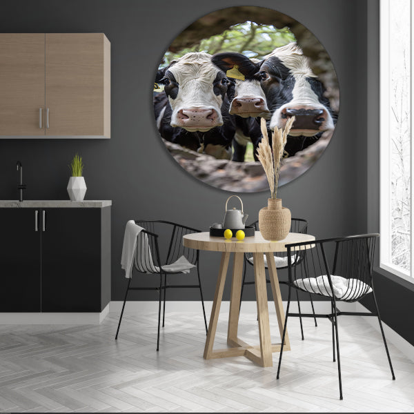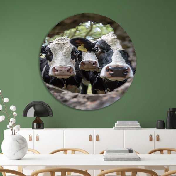 Twee nieuwsgierige koeien gluren door boom forex muurcirkel