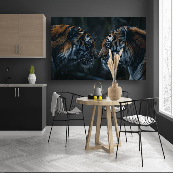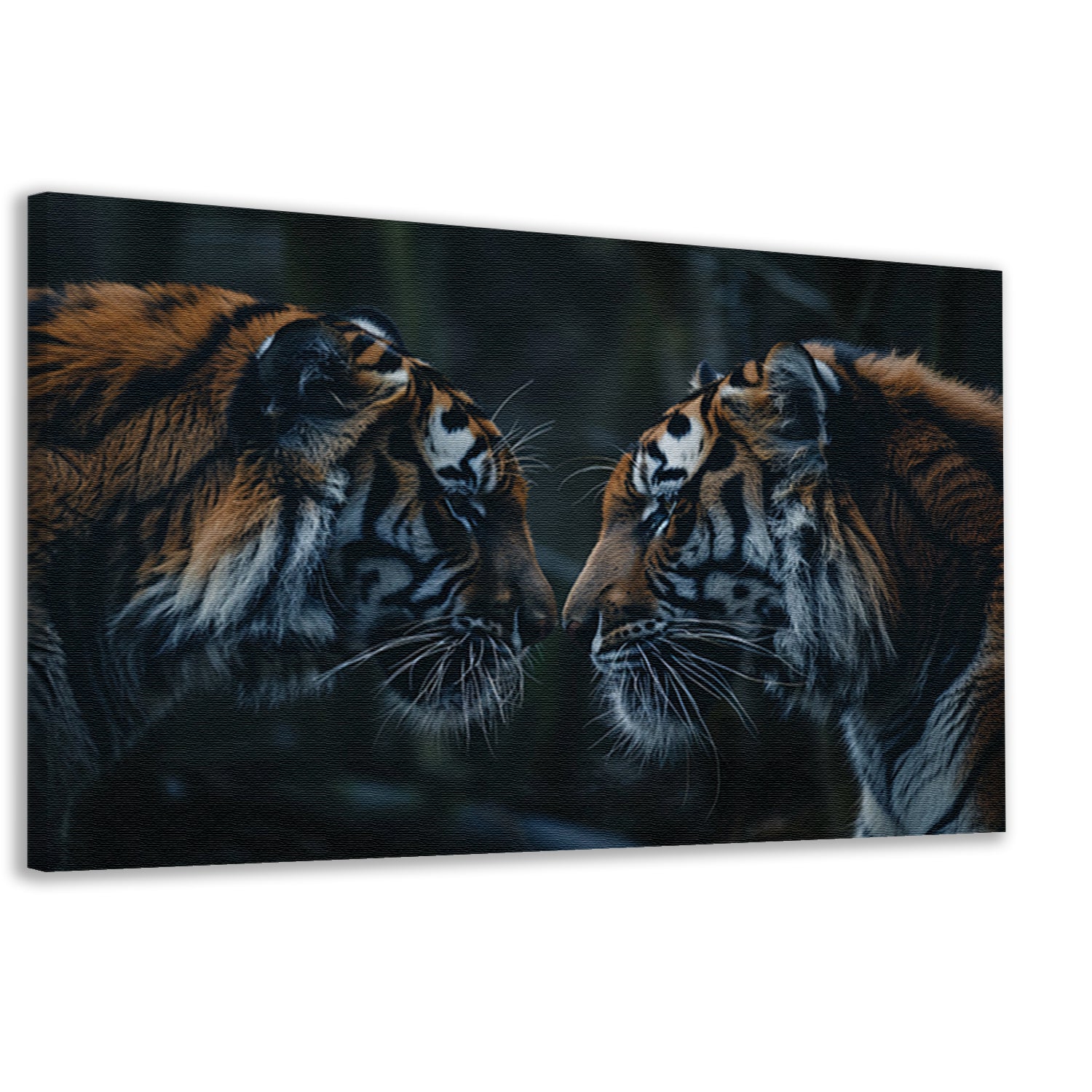 Twee tijgers in donker bos tegenover elkaar canvas