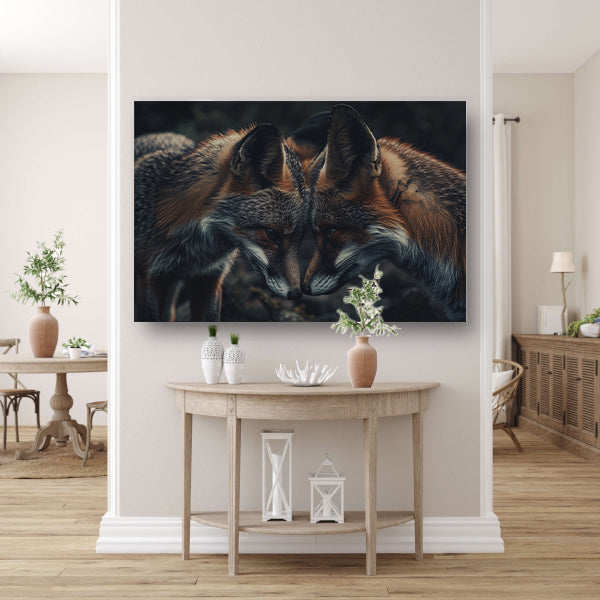 Twee vossen tegenover elkaar in donkere omgeving acrylglas