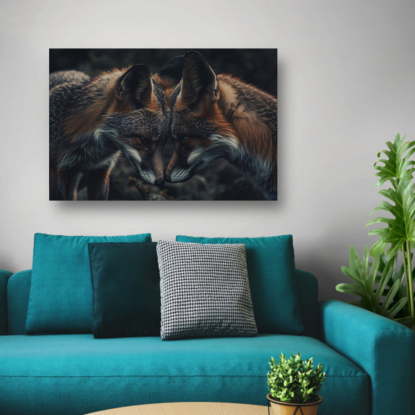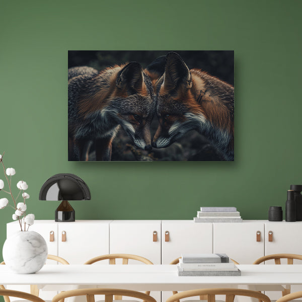 Twee vossen tegenover elkaar in donkere omgeving canvas