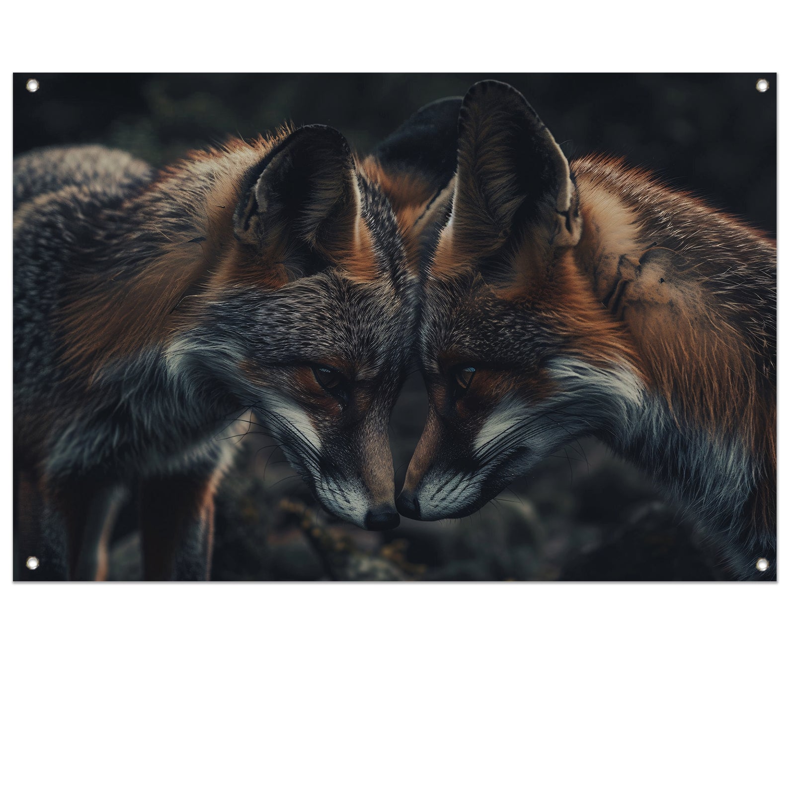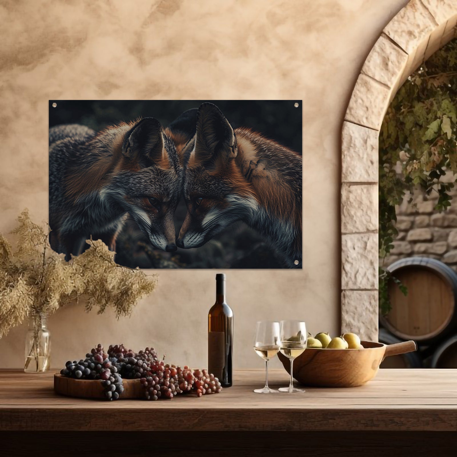 Twee vossen tegenover elkaar in donkere omgeving tuinposter