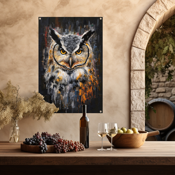 Uil met Oranje Ogen op Abstracte Achtergrond tuinposter