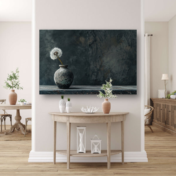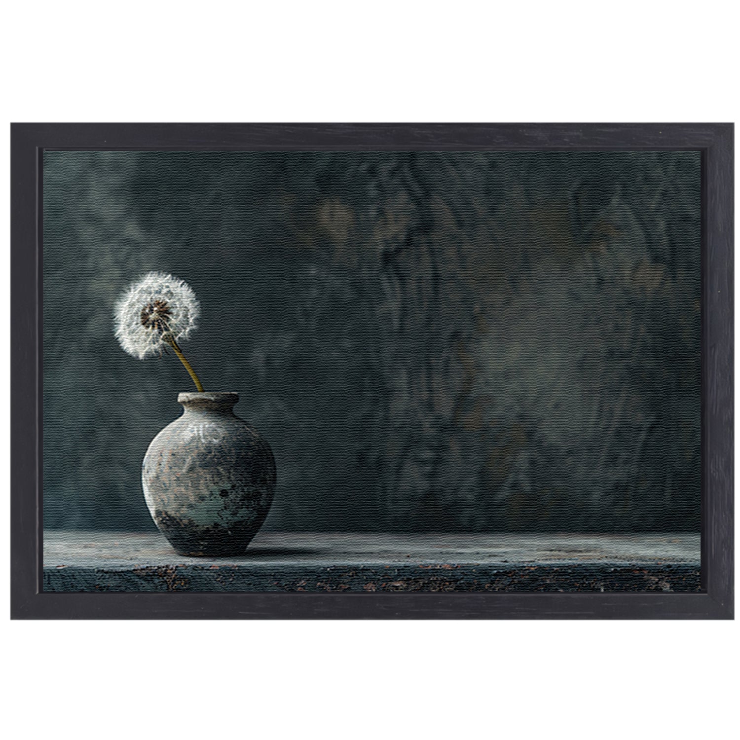 Uitgebloeide paardenbloem in oude vaas canvas met baklijst