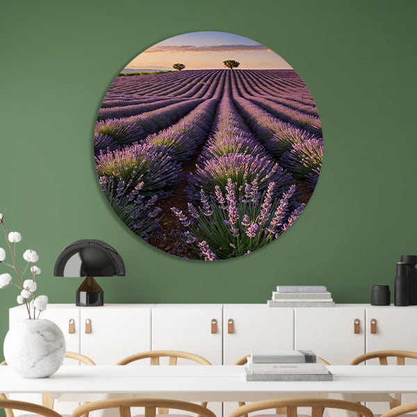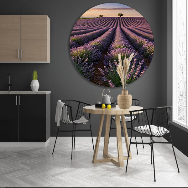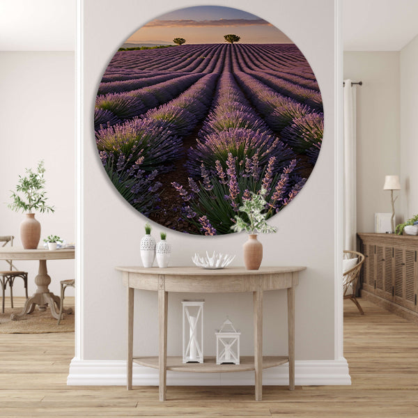 Breng de schoonheid van de natuur in huis met deze adembenemende muurcirkel en geniet elke dag van de rustgevende uitstraling van een lavendelveld bij zonsondergang.
