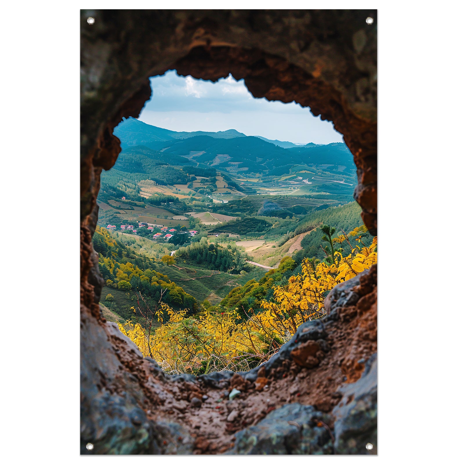 Uitkijk op een Berglandschap door een Stenen Venster tuinposter