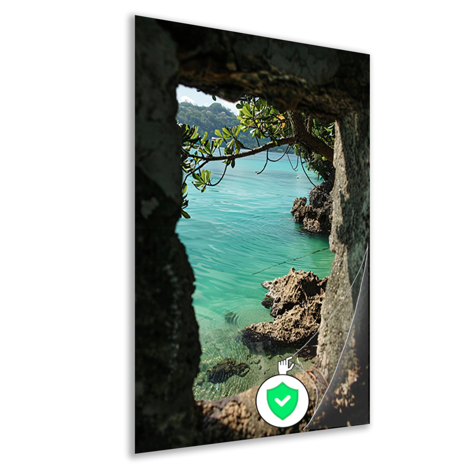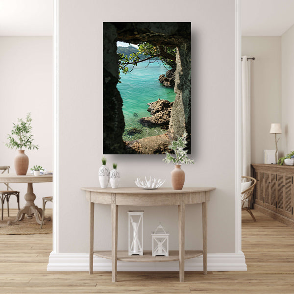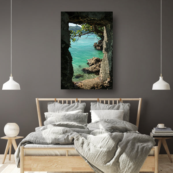 Uitzicht op zee door stenen raam poster