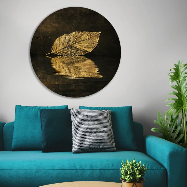 Verguld blad drijvend op sepia water aluminium muurcirkel