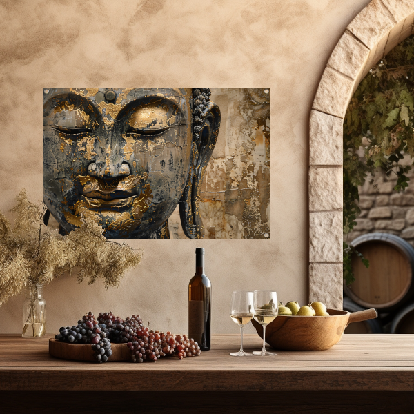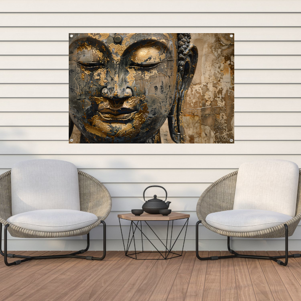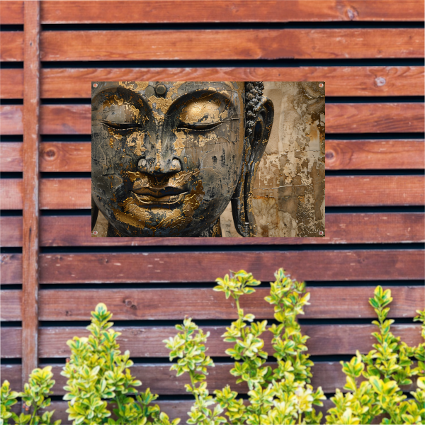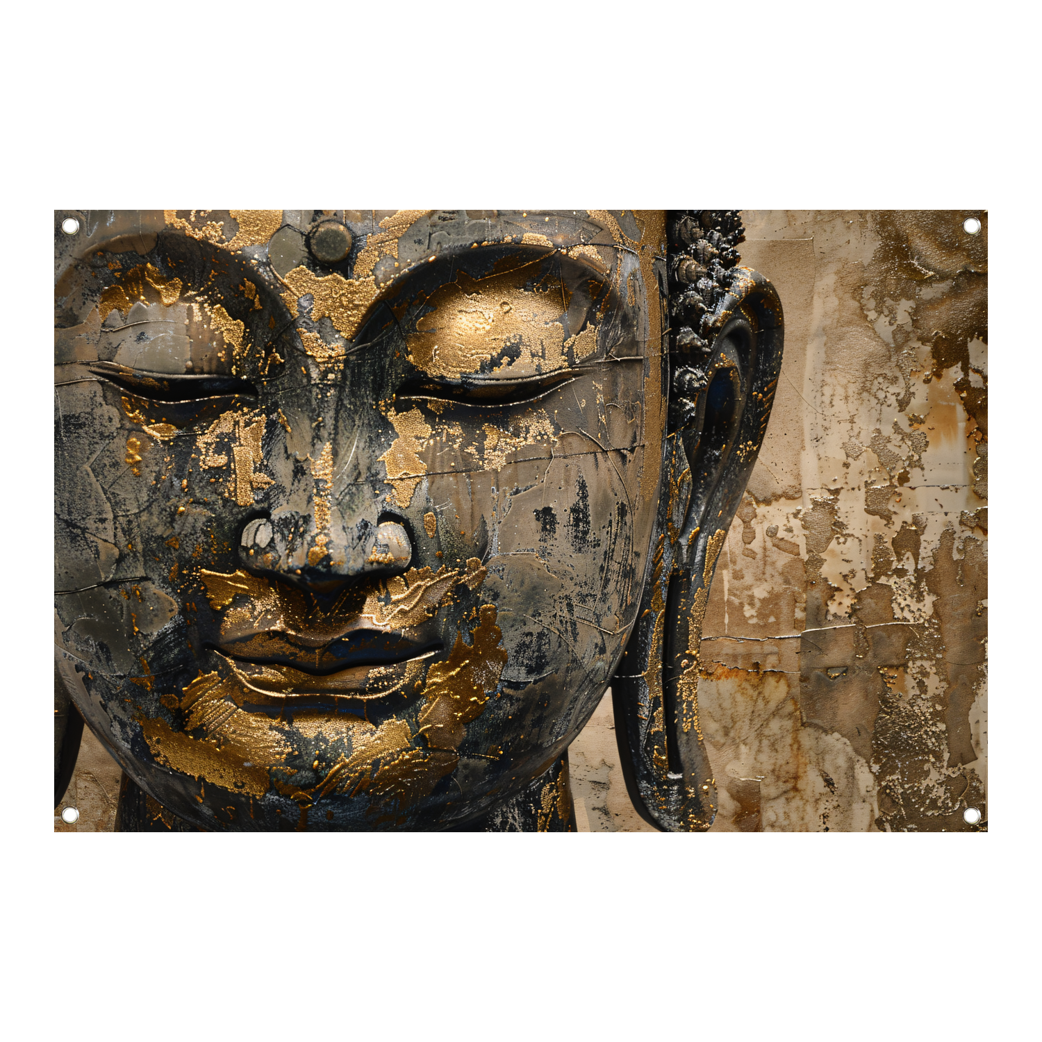 Vergulde Boeddha op verweerde achtergrond in gouden toetsen tuinposter