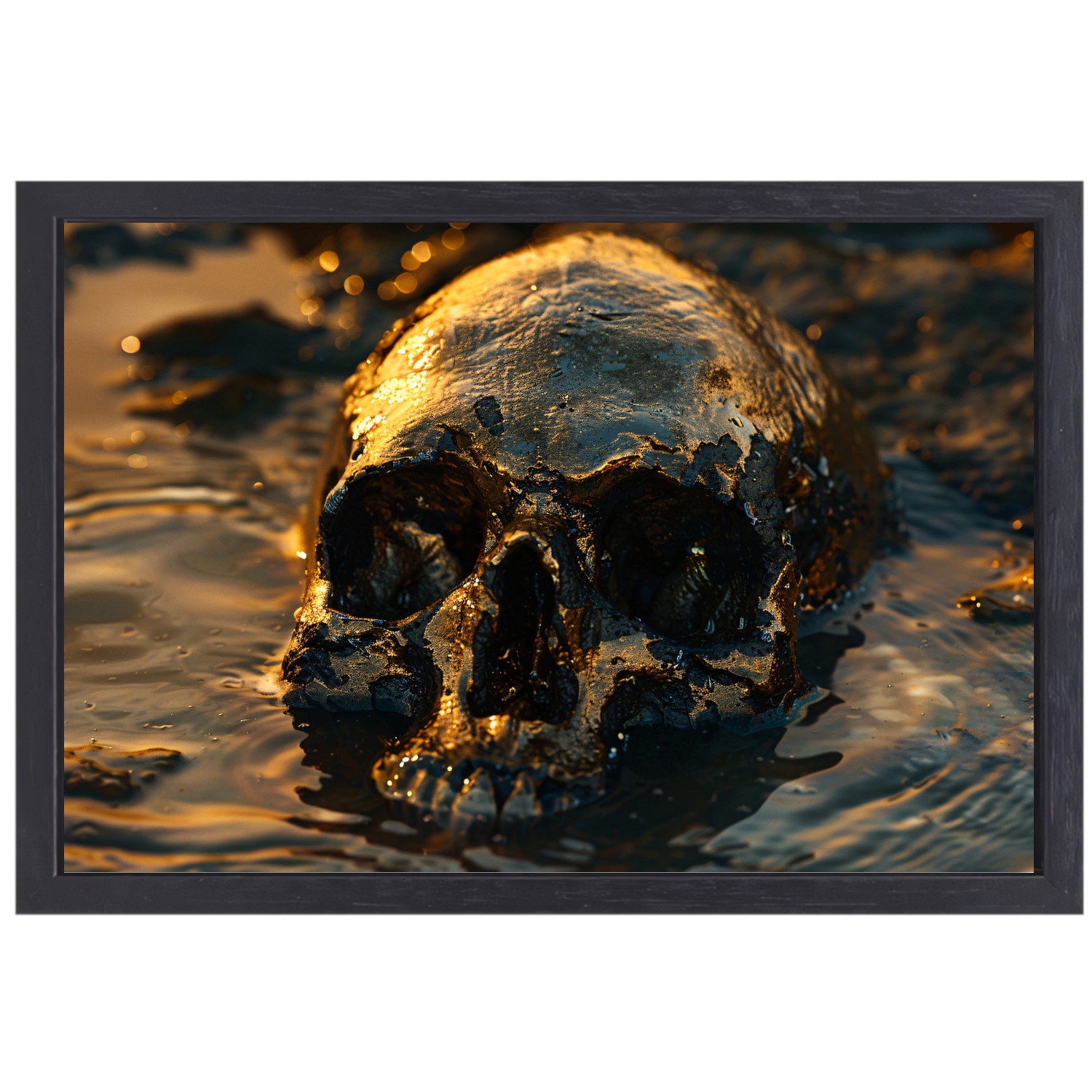 Vergulde schedel rustend in schemerig water canvas met baklijst
