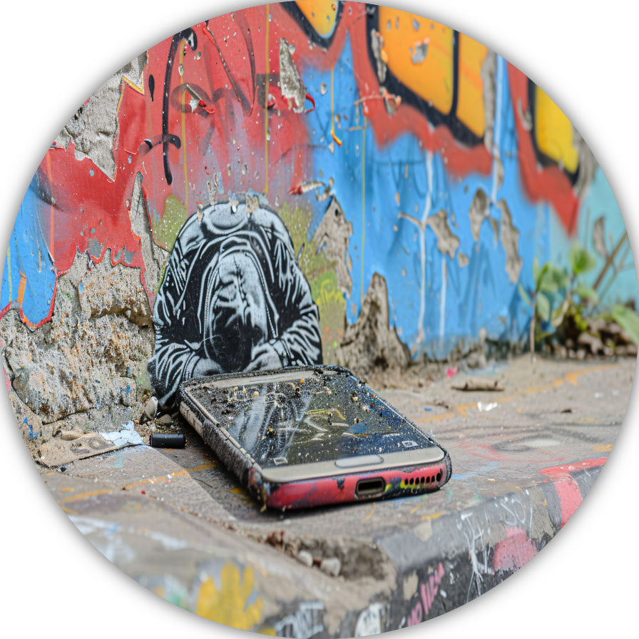 Verlaten Smartphone tegen Kleurrijke Graffiti aluminium muurcirkel