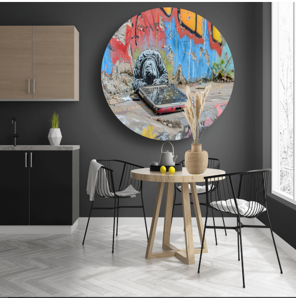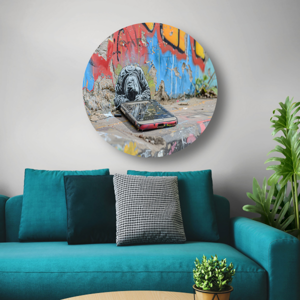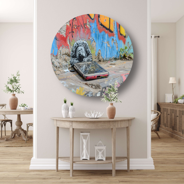 Bestel vandaag nog jouw verlaten smartphone tegen kleurrijke graffiti aluminium muurcirkel en geef je ruimte een creatieve touch!