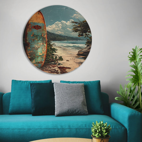Met deze muurcirkel haal je niet alleen een stukje paradijs in huis, maar ook een eyecatcher die direct de aandacht zal trekken. De verlaten surfplank op het tropische strand zorgt voor een rustgevende en ontspannen sfeer in elke ruimte. De muurcirkel is verkrijgbaar in diverse afmetingen, zodat je altijd een formaat kunt kiezen dat perfect bij jouw interieur past.